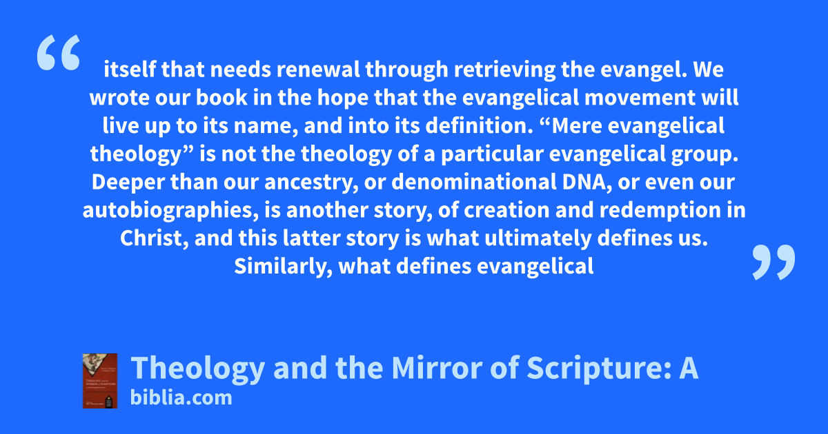 itself that needs renewal through retrieving the evangel. We wrote our book in the hope that the evangelical movement will live up to its name, and into its definition. “Mere evangelical theology” is not the theology of a particular evangelical group. Deeper than our ancestry, or denominational DNA, or even our autobiographies, is another story, of creation and redemption in Christ, and this latter story is what ultimately defines us. Similarly, what defines evangelical