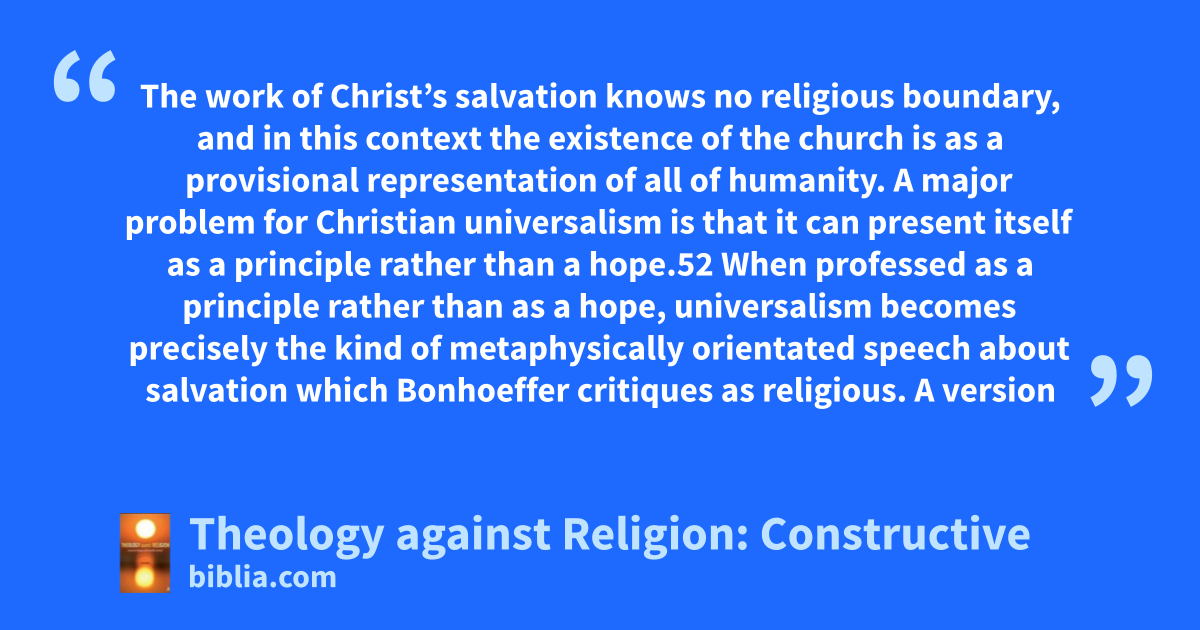 The work of Christ’s salvation knows no religious boundary, and in this context the existence of the church is as a provisional representation of all of humanity. A major problem for Christian universalism is that it can present itself as a principle rather than a hope.52 When professed as a principle rather than as a hope, universalism becomes precisely the kind of metaphysically orientated speech about salvation which Bonhoeffer critiques as religious. A version