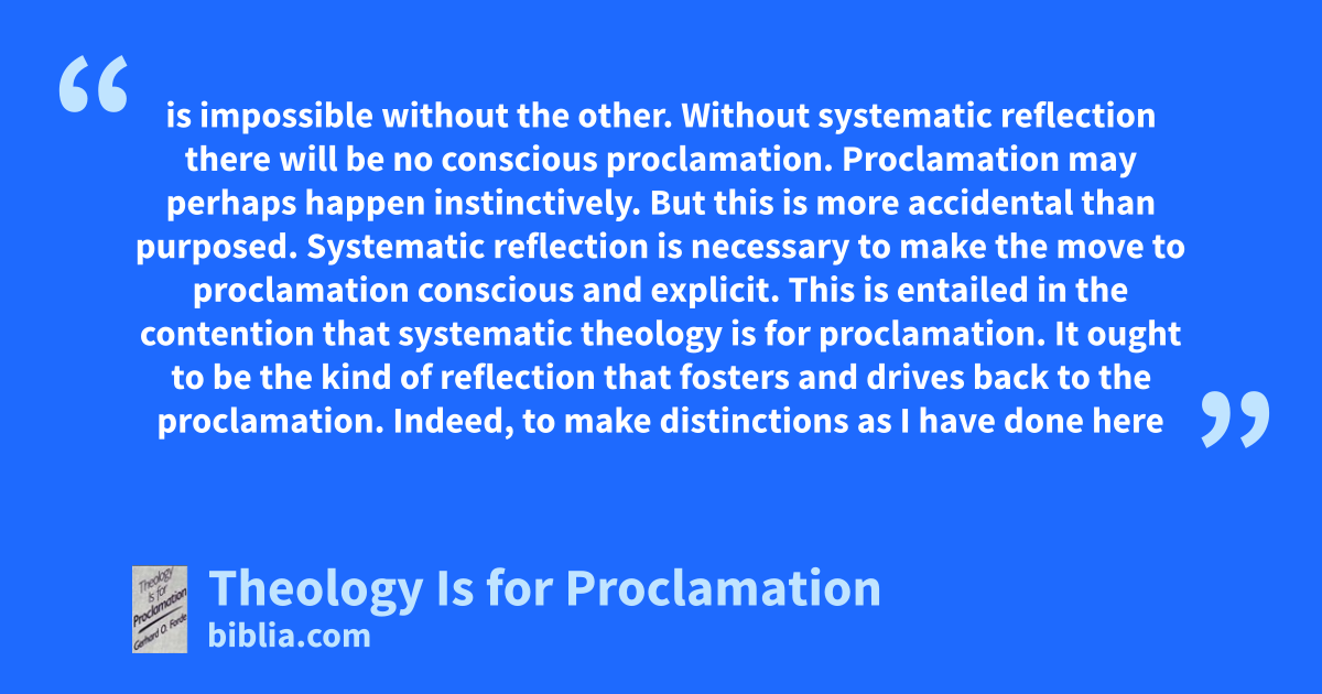 is impossible without the other. Without systematic reflection there will be no conscious proclamation. Proclamation may perhaps happen instinctively. But this is more accidental than purposed. Systematic reflection is necessary to make the move to proclamation conscious and explicit. This is entailed in the contention that systematic theology is for proclamation. It ought to be the kind of reflection that fosters and drives back to the proclamation. Indeed, to make distinctions as I have done here