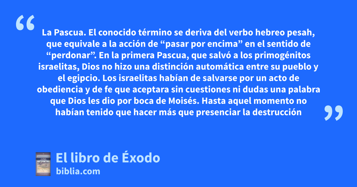 La Pascua. El conocido término se deriva del verbo hebreo pesah, que equivale a la acción de “pasar por encima” en el sentido de “perdonar”. En la primera Pascua, que salvó a los primogénitos israelitas, Dios no hizo una distinción automática entre su pueblo y el egipcio. Los israelitas habían de salvarse por un acto de obediencia y de fe que aceptara sin cuestiones ni dudas una palabra que Dios les dio por boca de Moisés. Hasta aquel momento no habían tenido que hacer más que presenciar la destrucción