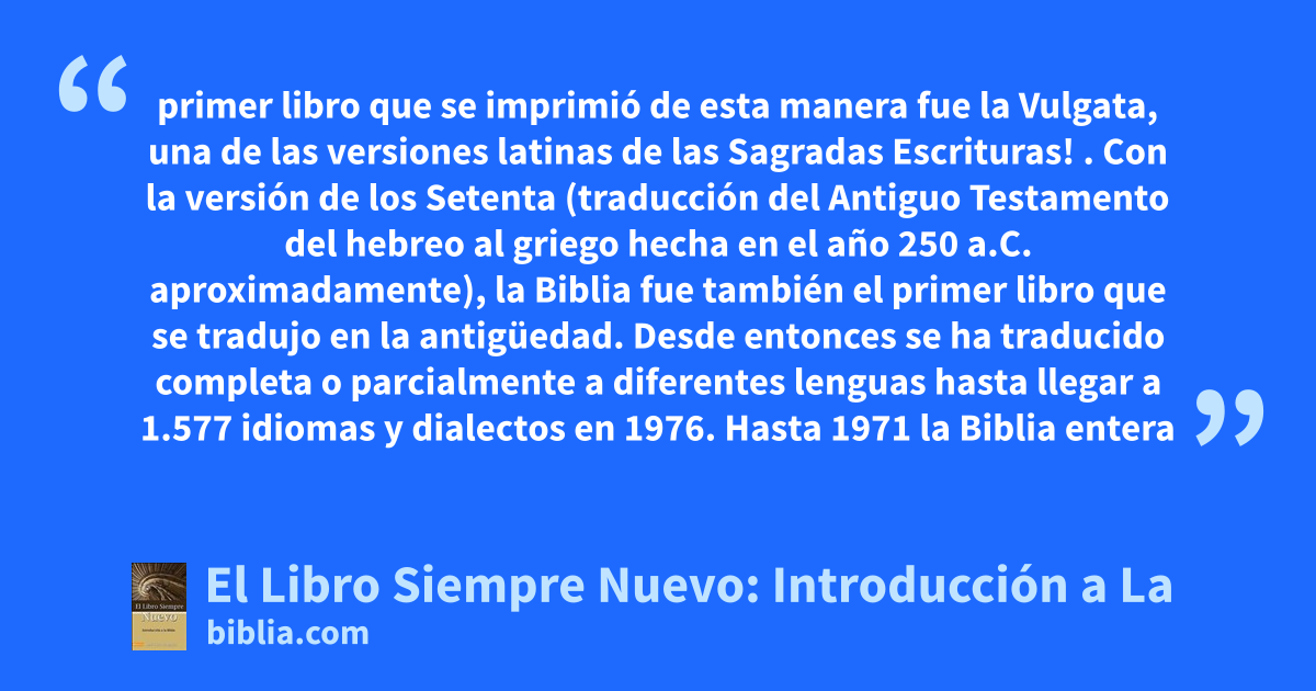 primer libro que se imprimió de esta manera fue la Vulgata, una de las versiones latinas de las Sagradas Escrituras! . Con la versión de los Setenta (traducción del Antiguo Testamento del hebreo al griego hecha en el año 250 a.C. aproximadamente), la Biblia fue también el primer libro que se tradujo en la antigüedad. Desde entonces se ha traducido completa o parcialmente a diferentes lenguas hasta llegar a 1.577 idiomas y dialectos en 1976. Hasta 1971 la Biblia entera