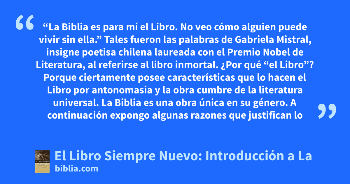 “La Biblia es para mí el Libro. No veo cómo alguien puede vivir sin ella.” Tales fueron las palabras de Gabriela Mistral, insigne poetisa chilena laureada con el Premio Nobel de Literatura, al referirse al libro inmortal. ¿Por qué “el Libro”? Porque ciertamente posee características que lo hacen el Libro por antonomasia y la obra cumbre de la literatura universal. La Biblia es una obra única en su género. A continuación expongo algunas razones que justifican lo