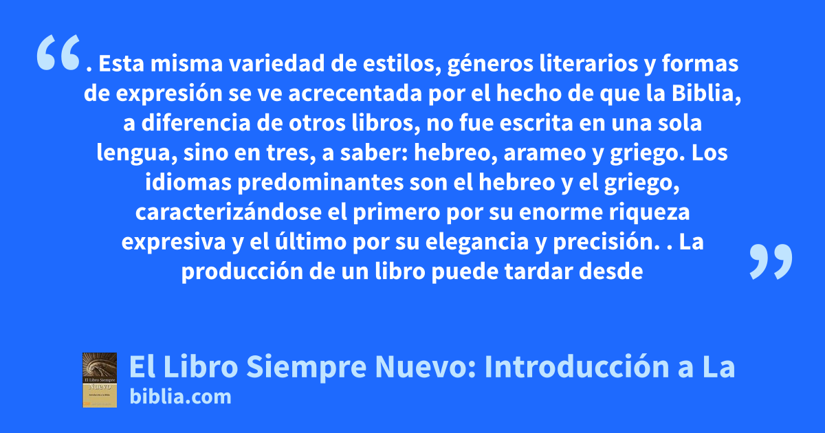 . Esta misma variedad de estilos, géneros literarios y formas de expresión se ve acrecentada por el hecho de que la Biblia, a diferencia de otros libros, no fue escrita en una sola lengua, sino en tres, a saber: hebreo, arameo y griego. Los idiomas predominantes son el hebreo y el griego, caracterizándose el primero por su enorme riqueza expresiva y el último por su elegancia y precisión. . La producción de un libro puede tardar desde