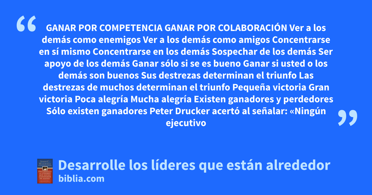 GANAR POR COMPETENCIA GANAR POR COLABORACIÓN Ver a los demás como enemigos Ver a los demás como amigos Concentrarse en sí mismo Concentrarse en los demás Sospechar de los demás Ser apoyo de los demás Ganar sólo si se es bueno Ganar si usted o los demás son buenos Sus destrezas determinan el triunfo Las destrezas de muchos determinan el triunfo Pequeña victoria Gran victoria Poca alegría Mucha alegría Existen ganadores y perdedores Sólo existen ganadores Peter Drucker acertó al señalar: «Ningún ejecutivo