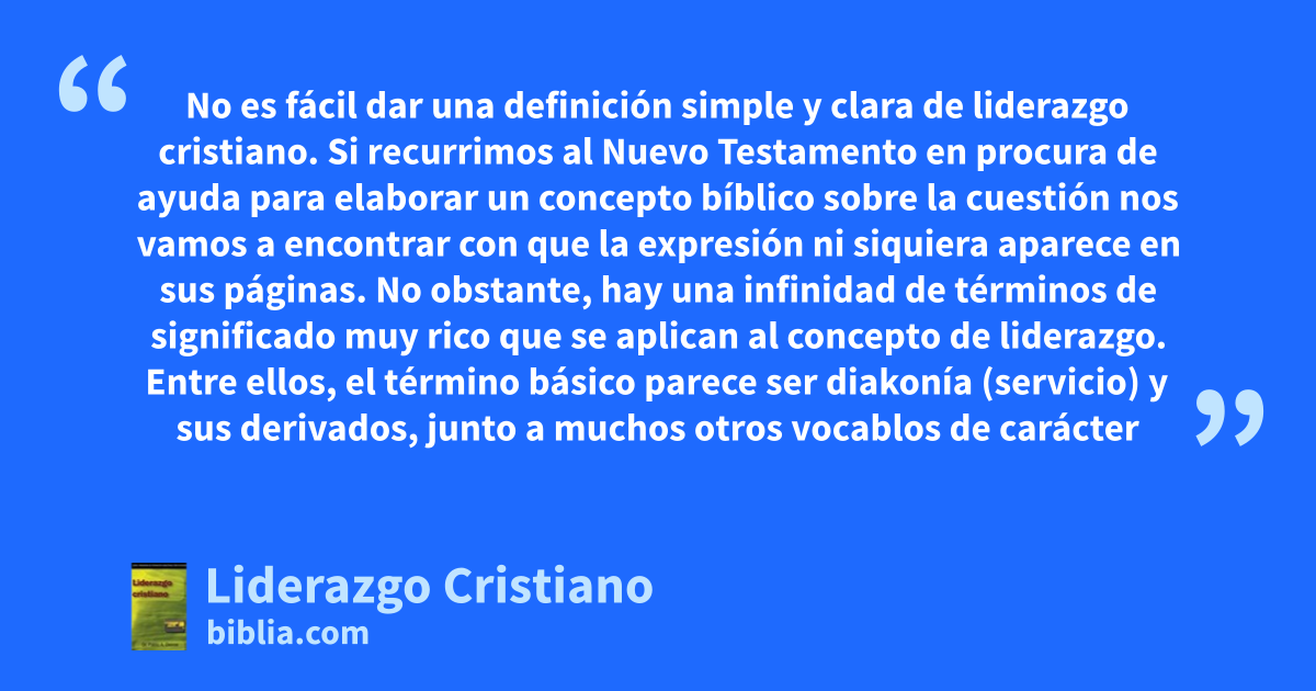 No es fácil dar una definición simple y clara de liderazgo cristiano. Si recurrimos al Nuevo Testamento en procura de ayuda para elaborar un concepto bíblico sobre la cuestión nos vamos a encontrar con que la expresión ni siquiera aparece en sus páginas. No obstante, hay una infinidad de términos de significado muy rico que se aplican al concepto de liderazgo. Entre ellos, el término básico parece ser diakonía (servicio) y sus derivados, junto a muchos otros vocablos de carácter