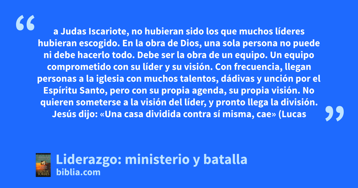 a Judas Iscariote, no hubieran sido los que muchos líderes hubieran escogido. En la obra de Dios, una sola persona no puede ni debe hacerlo todo. Debe ser la obra de un equipo. Un equipo comprometido con su líder y su visión. Con frecuencia, llegan personas a la iglesia con muchos talentos, dádivas y unción por el Espíritu Santo, pero con su propia agenda, su propia visión. No quieren someterse a la visión del líder, y pronto llega la división. Jesús dijo: «Una casa dividida contra sí misma, cae» (Lucas