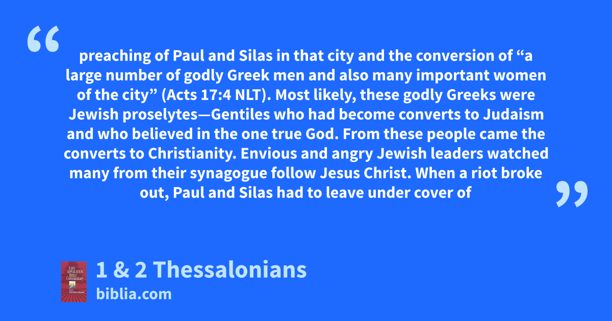 preaching of Paul and Silas in that city and the conversion of “a large number of godly Greek men and also many important women of the city” (Acts 17:4 NLT). Most likely, these godly Greeks were Jewish proselytes—Gentiles who had become converts to Judaism and who believed in the one true God. From these people came the converts to Christianity. Envious and angry Jewish leaders watched many from their synagogue follow Jesus Christ. When a riot broke out, Paul and Silas had to leave under cover of