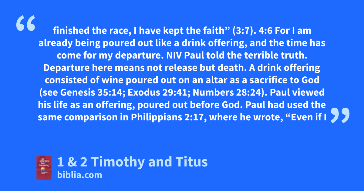 finished the race, I have kept the faith” (3:7). 4:6 For I am already being poured out like a drink offering, and the time has come for my departure. NIV Paul told the terrible truth. Departure here means not release but death. A drink offering consisted of wine poured out on an altar as a sacrifice to God (see Genesis 35:14; Exodus 29:41; Numbers 28:24). Paul viewed his life as an offering, poured out before God. Paul had used the same comparison in Philippians 2:17, where he wrote, “Even if I