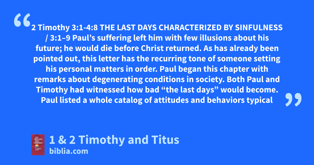 2 Timothy 3:1-4:8 THE LAST DAYS CHARACTERIZED BY SINFULNESS / 3:1–9 Paul’s suffering left him with few illusions about his future; he would die before Christ returned. As has already been pointed out, this letter has the recurring tone of someone setting his personal matters in order. Paul began this chapter with remarks about degenerating conditions in society. Both Paul and Timothy had witnessed how bad “the last days” would become. Paul listed a whole catalog of attitudes and behaviors typical