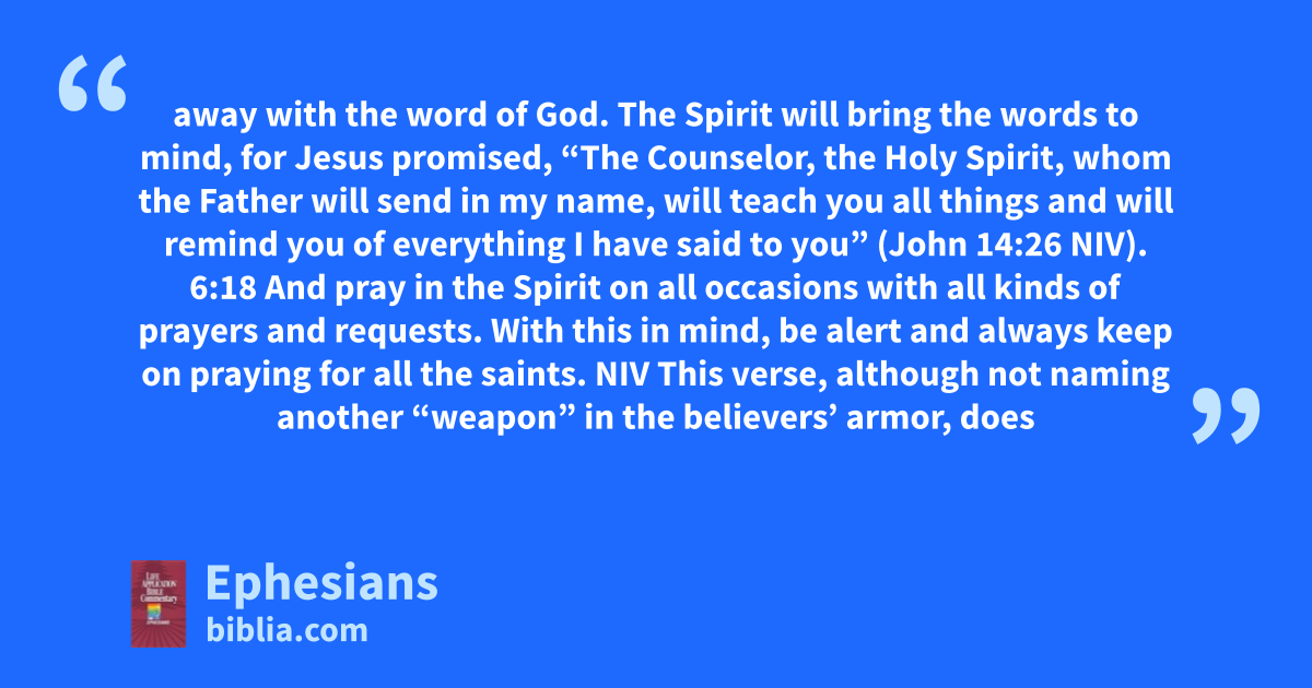 away with the word of God. The Spirit will bring the words to mind, for Jesus promised, “The Counselor, the Holy Spirit, whom the Father will send in my name, will teach you all things and will remind you of everything I have said to you” (John 14:26 NIV). 6:18 And pray in the Spirit on all occasions with all kinds of prayers and requests. With this in mind, be alert and always keep on praying for all the saints. NIV This verse, although not naming another “weapon” in the believers’ armor, does