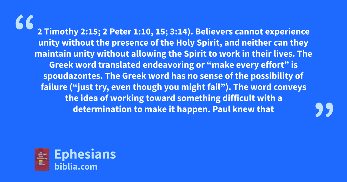2 Timothy 2:15; 2 Peter 1:10, 15; 3:14). Believers cannot experience unity without the presence of the Holy Spirit, and neither can they maintain unity without allowing the Spirit to work in their lives. The Greek word translated endeavoring or “make every effort” is spoudazontes. The Greek word has no sense of the possibility of failure (“just try, even though you might fail”). The word conveys the idea of working toward something difficult with a determination to make it happen. Paul knew that