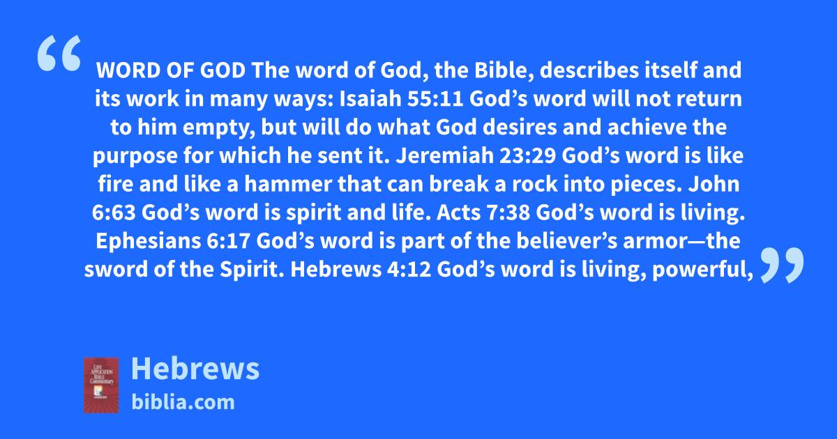 WORD OF GOD The word of God, the Bible, describes itself and its work in many ways: Isaiah 55:11 God’s word will not return to him empty, but will do what God desires and achieve the purpose for which he sent it. Jeremiah 23:29 God’s word is like fire and like a hammer that can break a rock into pieces. John 6:63 God’s word is spirit and life. Acts 7:38 God’s word is living. Ephesians 6:17 God’s word is part of the believer’s armor—the sword of the Spirit. Hebrews 4:12 God’s word is living, powerful,