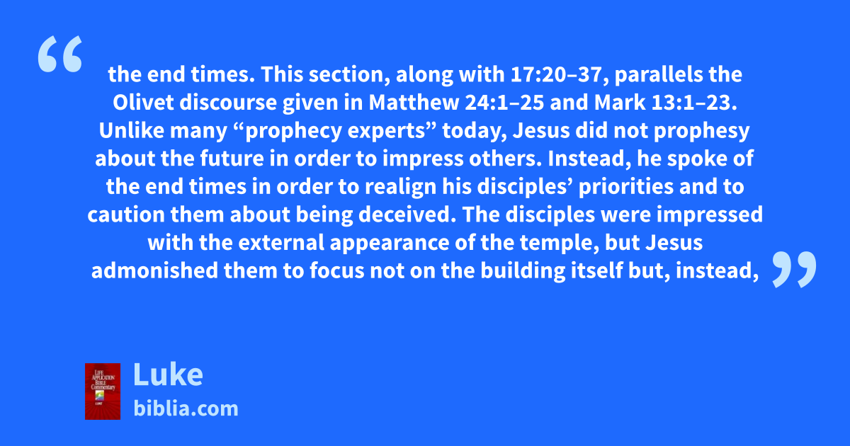 the end times. This section, along with 17:20–37, parallels the Olivet discourse given in Matthew 24:1–25 and Mark 13:1–23. Unlike many “prophecy experts” today, Jesus did not prophesy about the future in order to impress others. Instead, he spoke of the end times in order to realign his disciples’ priorities and to caution them about being deceived. The disciples were impressed with the external appearance of the temple, but Jesus admonished them to focus not on the building itself but, instead,