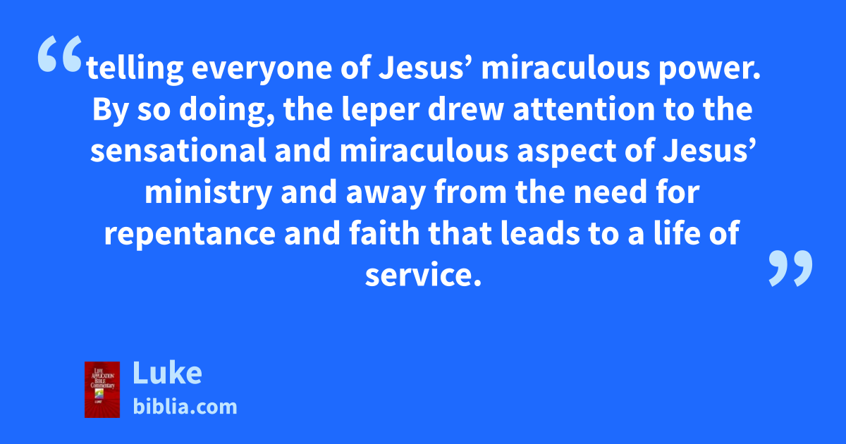 telling everyone of Jesus’ miraculous power. By so doing, the leper drew attention to the sensational and miraculous aspect of Jesus’ ministry and away from the need for repentance and faith that leads to a life of service.