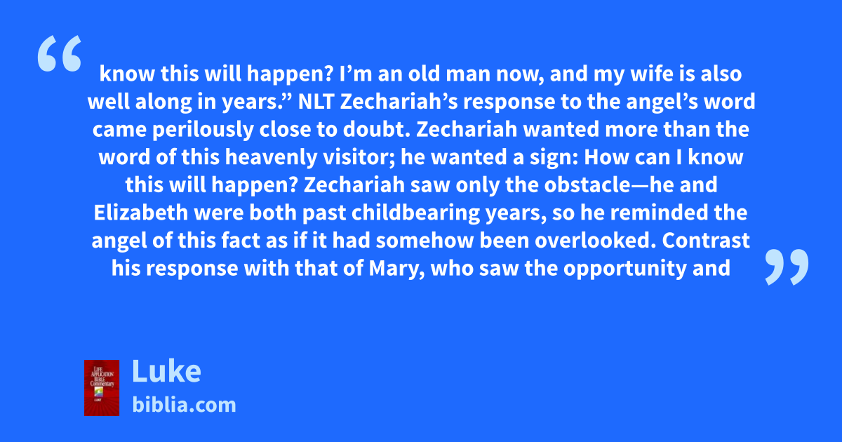 know this will happen? I’m an old man now, and my wife is also well along in years.” NLT Zechariah’s response to the angel’s word came perilously close to doubt. Zechariah wanted more than the word of this heavenly visitor; he wanted a sign: How can I know this will happen? Zechariah saw only the obstacle—he and Elizabeth were both past childbearing years, so he reminded the angel of this fact as if it had somehow been overlooked. Contrast his response with that of Mary, who saw the opportunity and