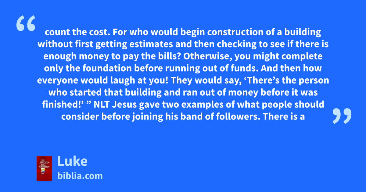 count the cost. For who would begin construction of a building without first getting estimates and then checking to see if there is enough money to pay the bills? Otherwise, you might complete only the foundation before running out of funds. And then how everyone would laugh at you! They would say, ‘There’s the person who started that building and ran out of money before it was finished!’ ” NLT Jesus gave two examples of what people should consider before joining his band of followers. There is a