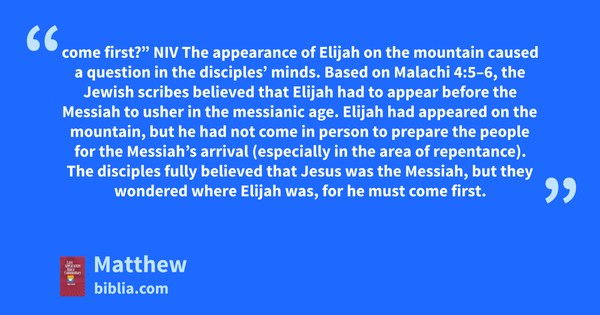 come first?” NIV The appearance of Elijah on the mountain caused a question in the disciples’ minds. Based on Malachi 4:5–6, the Jewish scribes believed that Elijah had to appear before the Messiah to usher in the messianic age. Elijah had appeared on the mountain, but he had not come in person to prepare the people for the Messiah’s arrival (especially in the area of repentance). The disciples fully believed that Jesus was the Messiah, but they wondered where Elijah was, for he must come first.