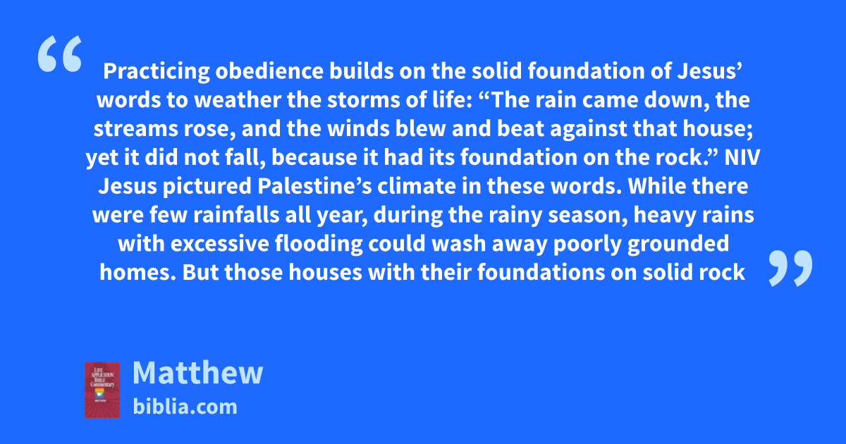 Practicing obedience builds on the solid foundation of Jesus’ words to weather the storms of life: “The rain came down, the streams rose, and the winds blew and beat against that house; yet it did not fall, because it had its foundation on the rock.” NIV Jesus pictured Palestine’s climate in these words. While there were few rainfalls all year, during the rainy season, heavy rains with excessive flooding could wash away poorly grounded homes. But those houses with their foundations on solid rock