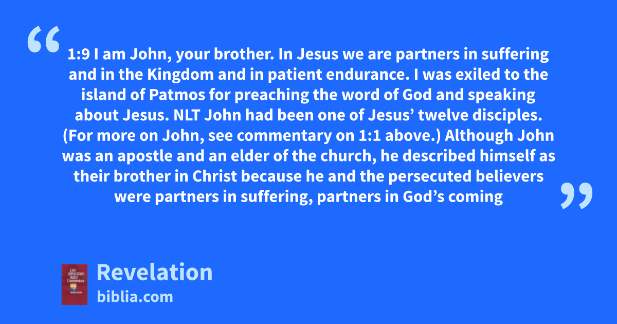 1:9 I am John, your brother. In Jesus we are partners in suffering and in the Kingdom and in patient endurance. I was exiled to the island of Patmos for preaching the word of God and speaking about Jesus. NLT John had been one of Jesus’ twelve disciples. (For more on John, see commentary on 1:1 above.) Although John was an apostle and an elder of the church, he described himself as their brother in Christ because he and the persecuted believers were partners in suffering, partners in God’s coming