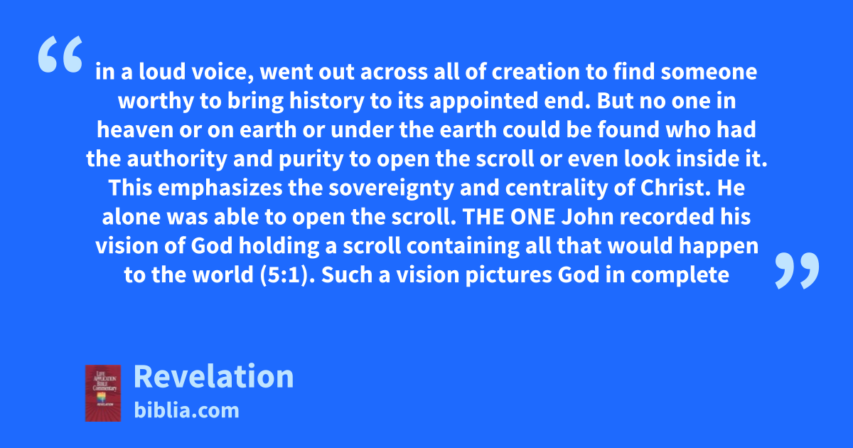 in a loud voice, went out across all of creation to find someone worthy to bring history to its appointed end. But no one in heaven or on earth or under the earth could be found who had the authority and purity to open the scroll or even look inside it. This emphasizes the sovereignty and centrality of Christ. He alone was able to open the scroll. THE ONE John recorded his vision of God holding a scroll containing all that would happen to the world (5:1). Such a vision pictures God in complete