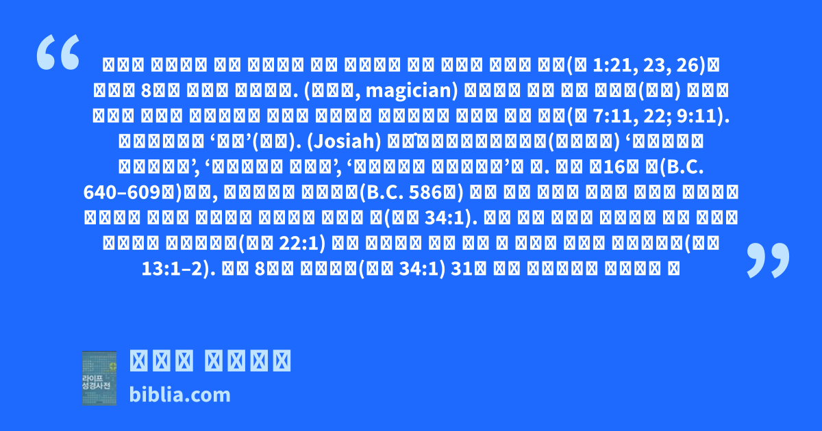 자리를 대신하기 위해 맛디아와 함께 사도들에 의해 후보로 올랐던 요셉(행 1:21, 23, 26)을 비롯해 8명의 요셉이 등장한다. (妖術師, magician) 주문이나 마술 혹은 속임수(술책) 등으로 놀라운 일들을 꾸며내거나 숨겨진 사실들을 들추어내는 마법사 또는 박수(출 7:11, 22; 9:11). 개역한글판의 ‘술객’(術客). (Josiah) יא̇שִׁיָּהוּ(요쉬야후) ‘여호와께서 고쳐주신다’, ‘여호와께서 주소서’, ‘여호와께서 지지하신다’는 뜻. 유다 제16대 왕(B.C. 640–609년)으로, 예루살렘이 멸망하기(B.C. 586년) 전에 유다 왕국의 마지막 종교적 부흥기를 주도하고 국가의 독립성을 유지했던 경건한 왕(대하 34:1). 아몬 왕과 보스갓 아다야의 딸인 여디다 사이에서 태어났는데(왕하 22:1) 그가 태어나기 전에 이미 그 사역과 이름이 예언되었다(왕상 13:1–2). 그는 8세에 즉위하여(대하 34:1) 31년 간을 통치하면서 경건했던 여
