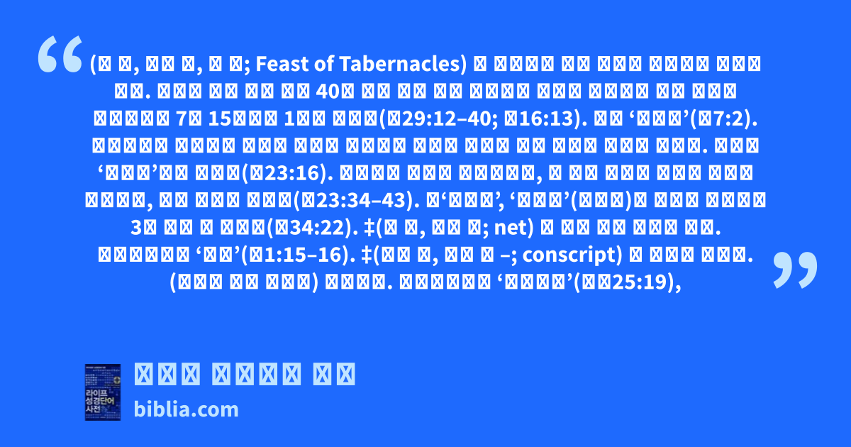 (풀 草, 장막 幕, 철 節; Feast of Tabernacles) 명 ●초막을 짓고 거기에 거주하며 지키는 절기. 출애굽 당시 광야 생활 40년 동안 지켜 주신 하나님의 은혜를 기념하기 위해 히브리 종교력으로 7월 15일부터 1주간 지켰다(민29:12–40; 신16:13). 일명 ‘장막절’(요7:2). ●초막절은 농사철이 끝나고 곡식을 저장하는 시기에 지켜져 추수 감사절 성격도 강했다. 그래서 ‘수장절’로도 불렸다(출23:16). 이날에는 노동이 금지되었고, 첫 날과 마지막 날에는 성회가 열렸으며, 매일 화제를 드렸다(레23:34–43). ●‘유월절’, ‘칠칠절’(오순절)과 더불어 이스라엘 3대 절기 중 하나다(출34:22). ‡(풀 草, 그물 網; net) 명 고기 잡는 그물의 일종. 개역개정판은 ‘투망’(합1:15–16). ‡(부를 招, 모을 募 –; conscript) 동 불러서 모으다. (전쟁에 나갈 군인을) 소집하다. 개역개정판은 ‘징집하다’(왕하25:19),