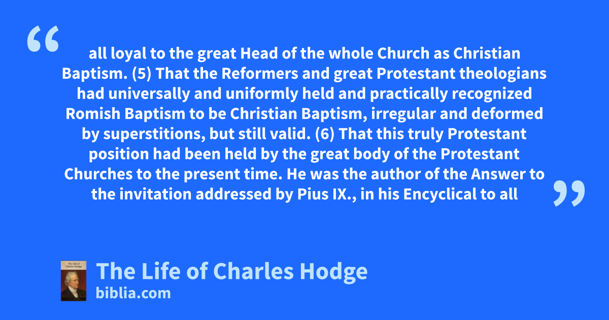 all loyal to the great Head of the whole Church as Christian Baptism. (5) That the Reformers and great Protestant theologians had universally and uniformly held and practically recognized Romish Baptism to be Christian Baptism, irregular and deformed by superstitions, but still valid. (6) That this truly Protestant position had been held by the great body of the Protestant Churches to the present time. He was the author of the Answer to the invitation addressed by Pius IX., in his Encyclical to all