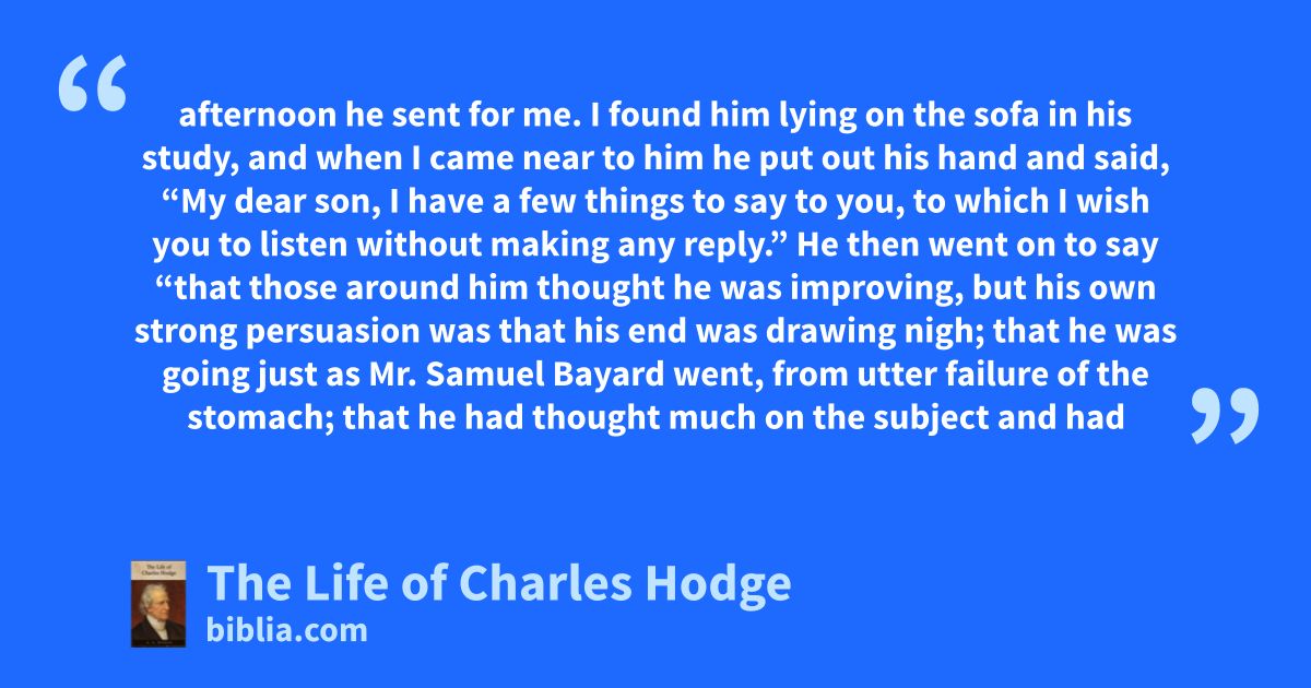 afternoon he sent for me. I found him lying on the sofa in his study, and when I came near to him he put out his hand and said, “My dear son, I have a few things to say to you, to which I wish you to listen without making any reply.” He then went on to say “that those around him thought he was improving, but his own strong persuasion was that his end was drawing nigh; that he was going just as Mr. Samuel Bayard went, from utter failure of the stomach; that he had thought much on the subject and had