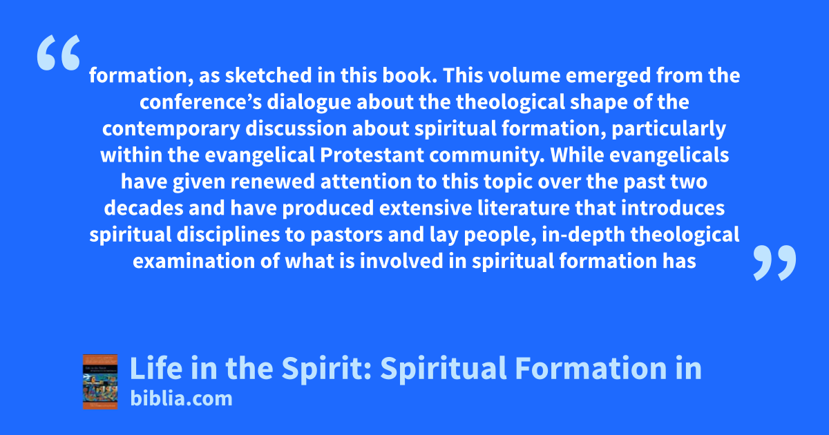 formation, as sketched in this book. This volume emerged from the conference’s dialogue about the theological shape of the contemporary discussion about spiritual formation, particularly within the evangelical Protestant community. While evangelicals have given renewed attention to this topic over the past two decades and have produced extensive literature that introduces spiritual disciplines to pastors and lay people, in-depth theological examination of what is involved in spiritual formation has
