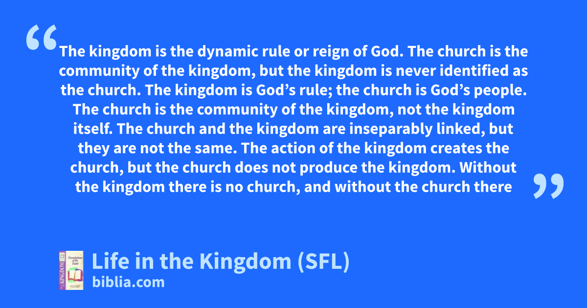 The kingdom is the dynamic rule or reign of God. The church is the community of the kingdom, but the kingdom is never identified as the church. The kingdom is God’s rule; the church is God’s people. The church is the community of the kingdom, not the kingdom itself. The church and the kingdom are inseparably linked, but they are not the same. The action of the kingdom creates the church, but the church does not produce the kingdom. Without the kingdom there is no church, and without the church there