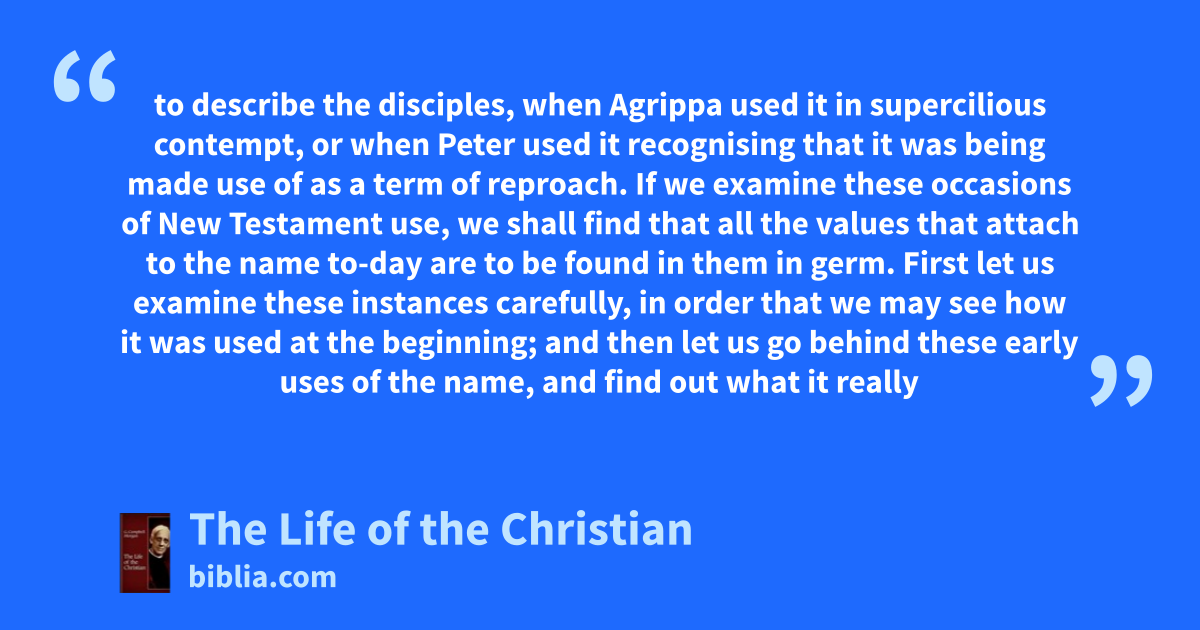 to describe the disciples, when Agrippa used it in supercilious contempt, or when Peter used it recognising that it was being made use of as a term of reproach. If we examine these occasions of New Testament use, we shall find that all the values that attach to the name to-day are to be found in them in germ. First let us examine these instances carefully, in order that we may see how it was used at the beginning; and then let us go behind these early uses of the name, and find out what it really