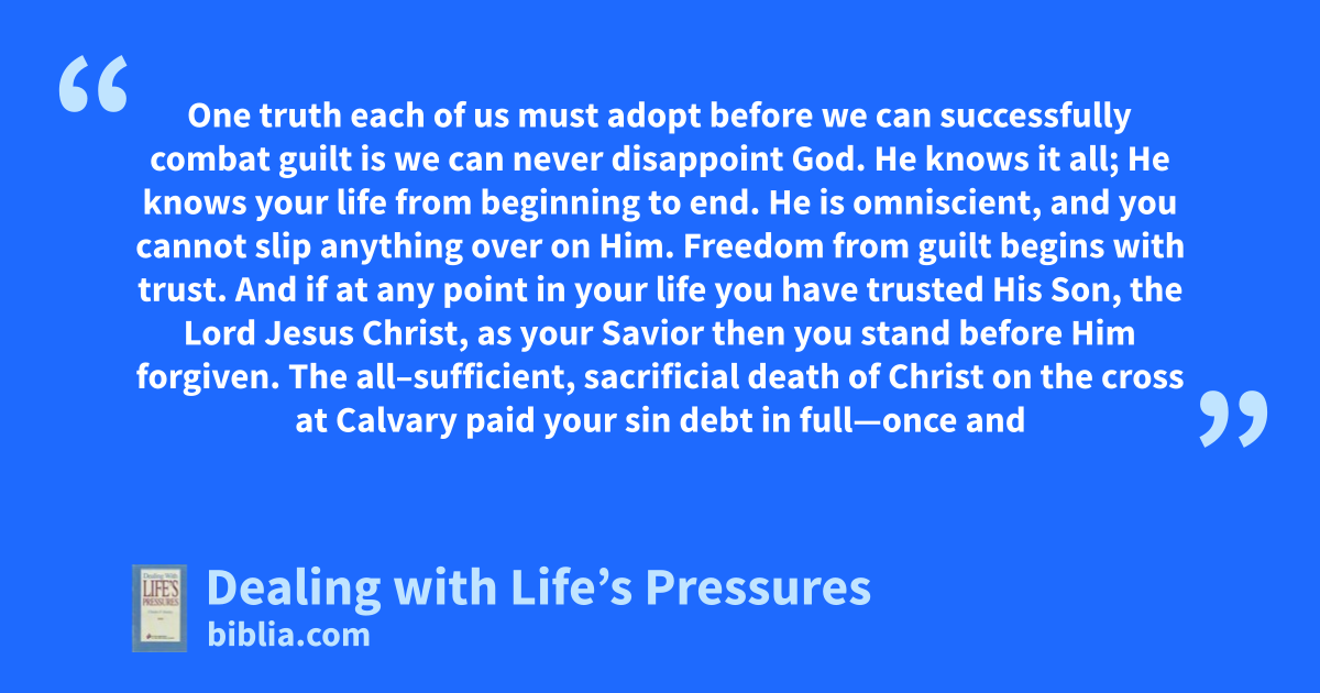 One truth each of us must adopt before we can successfully combat guilt is we can never disappoint God. He knows it all; He knows your life from beginning to end. He is omniscient, and you cannot slip anything over on Him. Freedom from guilt begins with trust. And if at any point in your life you have trusted His Son, the Lord Jesus Christ, as your Savior then you stand before Him forgiven. The all–sufficient, sacrificial death of Christ on the cross at Calvary paid your sin debt in full—once and