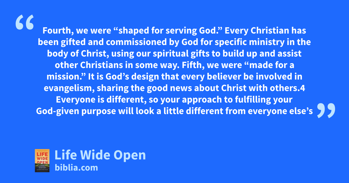 Fourth, we were “shaped for serving God.” Every Christian has been gifted and commissioned by God for specific ministry in the body of Christ, using our spiritual gifts to build up and assist other Christians in some way. Fifth, we were “made for a mission.” It is God’s design that every believer be involved in evangelism, sharing the good news about Christ with others.4 Everyone is different, so your approach to fulfilling your God-given purpose will look a little different from everyone else’s