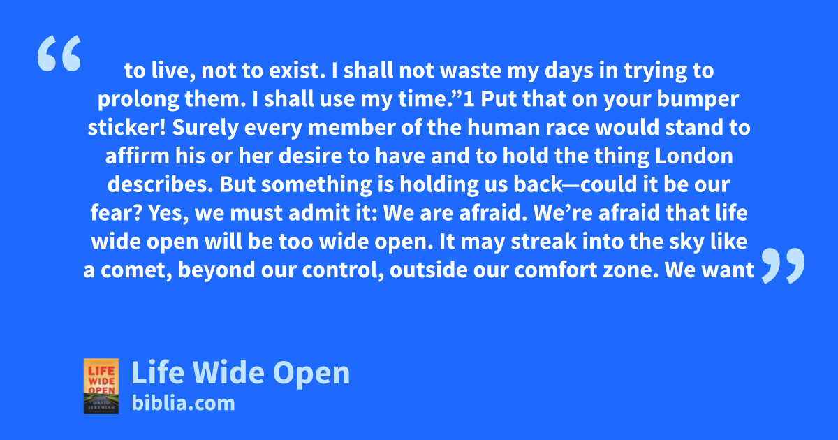 to live, not to exist. I shall not waste my days in trying to prolong them. I shall use my time.”1 Put that on your bumper sticker! Surely every member of the human race would stand to affirm his or her desire to have and to hold the thing London describes. But something is holding us back—could it be our fear? Yes, we must admit it: We are afraid. We’re afraid that life wide open will be too wide open. It may streak into the sky like a comet, beyond our control, outside our comfort zone. We want