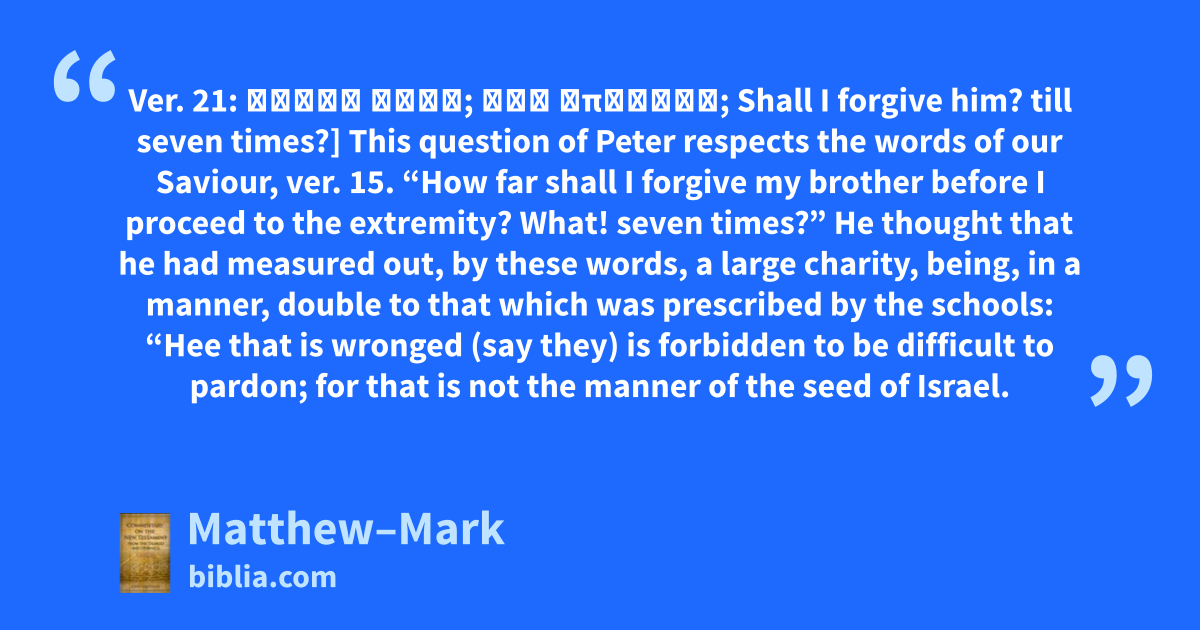 Ver. 21: Ἀφήσω αὐτῷ; ἕως ἑπτάκις; Shall I forgive him? till seven times?] This question of Peter respects the words of our Saviour, ver. 15. “How far shall I forgive my brother before I proceed to the extremity? What! seven times?” He thought that he had measured out, by these words, a large charity, being, in a manner, double to that which was prescribed by the schools: “Hee that is wronged (say they) is forbidden to be difficult to pardon; for that is not the manner of the seed of Israel.