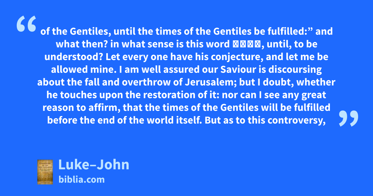of the Gentiles, until the times of the Gentiles be fulfilled:” and what then? in what sense is this word ἄχρι, until, to be understood? Let every one have his conjecture, and let me be allowed mine. I am well assured our Saviour is discoursing about the fall and overthrow of Jerusalem; but I doubt, whether he touches upon the restoration of it: nor can I see any great reason to affirm, that the times of the Gentiles will be fulfilled before the end of the world itself. But as to this controversy,