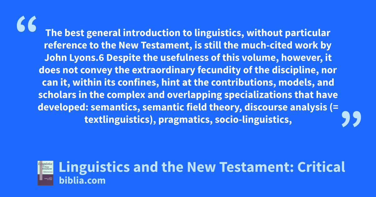 The best general introduction to linguistics, without particular reference to the New Testament, is still the much-cited work by John Lyons.6 Despite the usefulness of this volume, however, it does not convey the extraordinary fecundity of the discipline, nor can it, within its confines, hint at the contributions, models, and scholars in the complex and overlapping specializations that have developed: semantics, semantic field theory, discourse analysis (= textlinguistics), pragmatics, socio-linguistics,