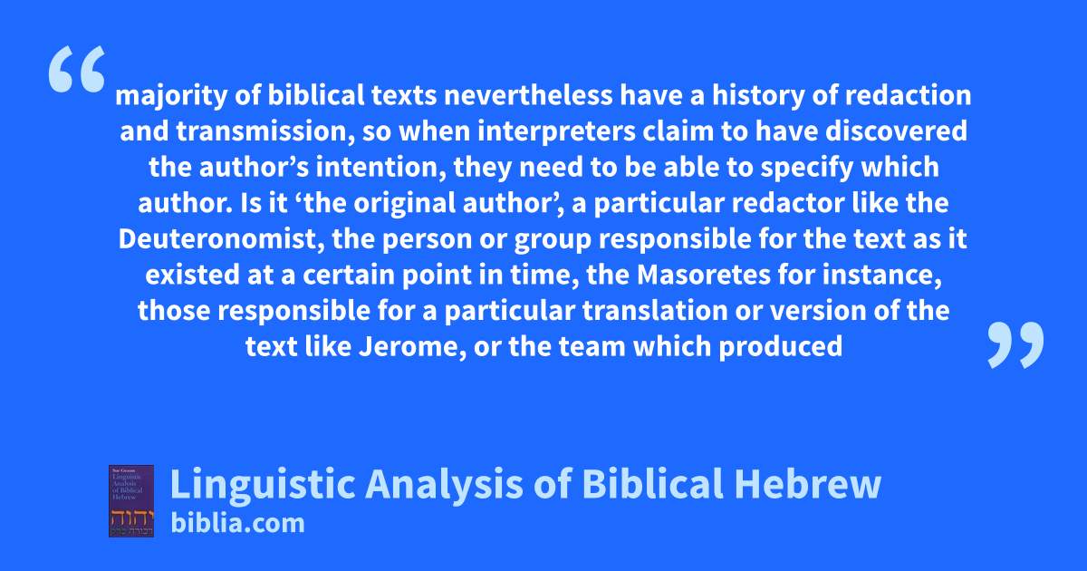 majority of biblical texts nevertheless have a history of redaction and transmission, so when interpreters claim to have discovered the author’s intention, they need to be able to specify which author. Is it ‘the original author’, a particular redactor like the Deuteronomist, the person or group responsible for the text as it existed at a certain point in time, the Masoretes for instance, those responsible for a particular translation or version of the text like Jerome, or the team which produced