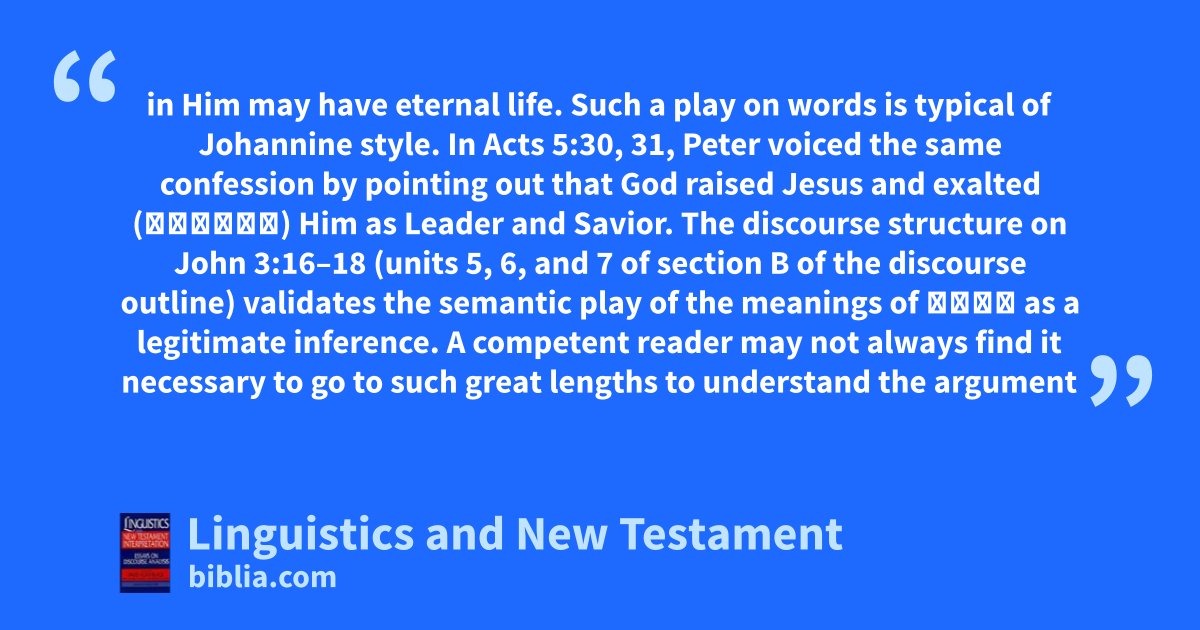in Him may have eternal life. Such a play on words is typical of Johannine style. In Acts 5:30, 31, Peter voiced the same confession by pointing out that God raised Jesus and exalted (ὕψωσεν) Him as Leader and Savior. The discourse structure on John 3:16–18 (units 5, 6, and 7 of section B of the discourse outline) validates the semantic play of the meanings of ὑψόω as a legitimate inference. A competent reader may not always find it necessary to go to such great lengths to understand the argument