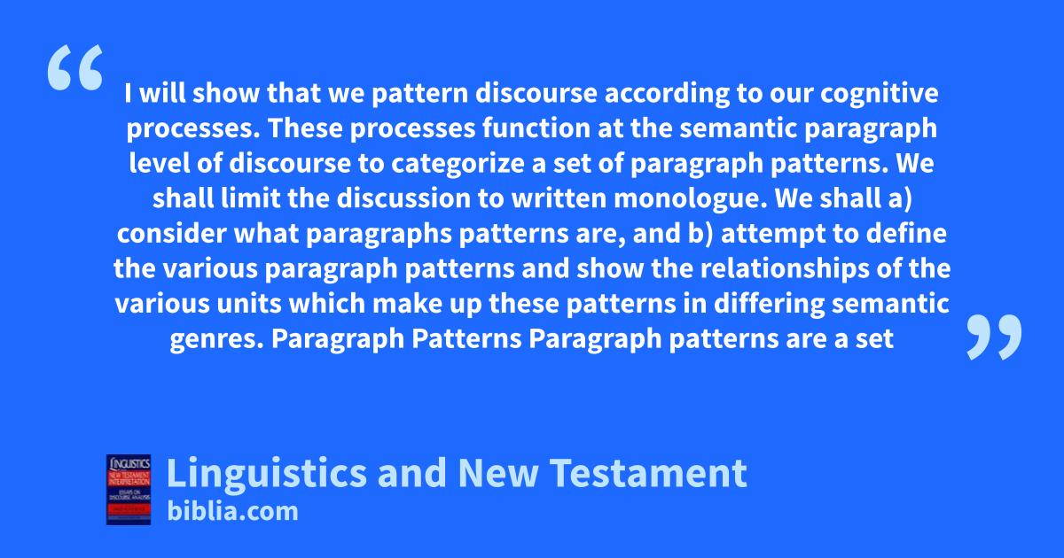 I will show that we pattern discourse according to our cognitive processes. These processes function at the semantic paragraph level of discourse to categorize a set of paragraph patterns. We shall limit the discussion to written monologue. We shall a) consider what paragraphs patterns are, and b) attempt to define the various paragraph patterns and show the relationships of the various units which make up these patterns in differing semantic genres. Paragraph Patterns Paragraph patterns are a set