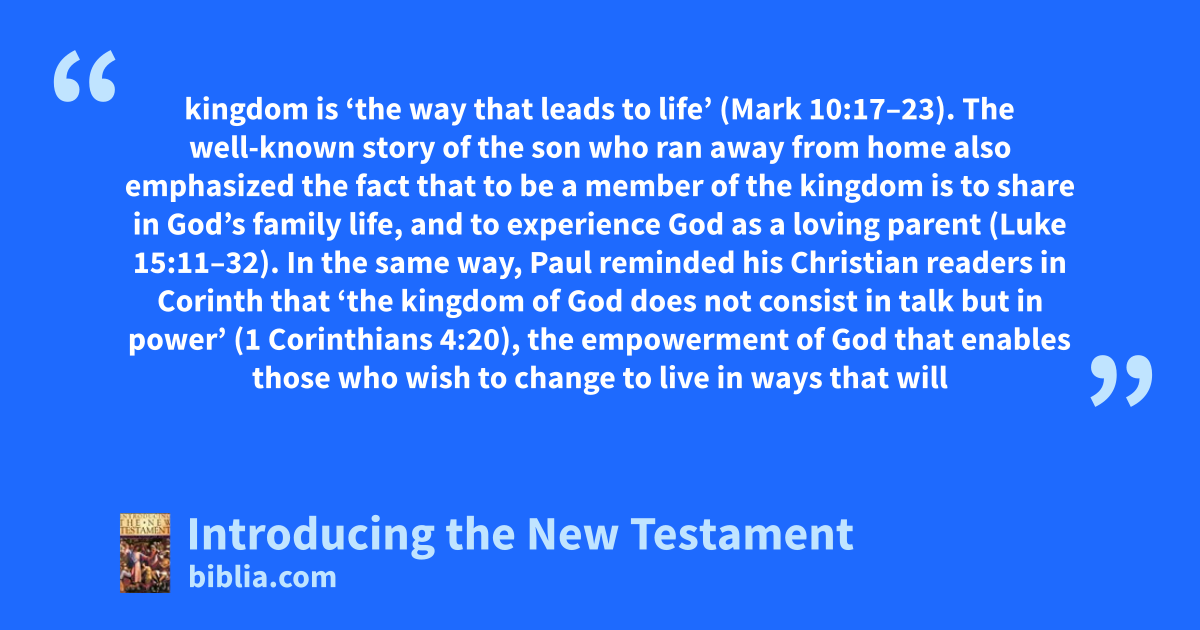 kingdom is ‘the way that leads to life’ (Mark 10:17–23). The well-known story of the son who ran away from home also emphasized the fact that to be a member of the kingdom is to share in God’s family life, and to experience God as a loving parent (Luke 15:11–32). In the same way, Paul reminded his Christian readers in Corinth that ‘the kingdom of God does not consist in talk but in power’ (1 Corinthians 4:20), the empowerment of God that enables those who wish to change to live in ways that will