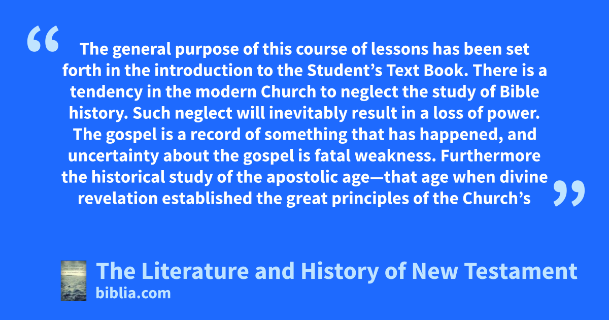 The general purpose of this course of lessons has been set forth in the introduction to the Student’s Text Book. There is a tendency in the modern Church to neglect the study of Bible history. Such neglect will inevitably result in a loss of power. The gospel is a record of something that has happened, and uncertainty about the gospel is fatal weakness. Furthermore the historical study of the apostolic age—that age when divine revelation established the great principles of the Church’s