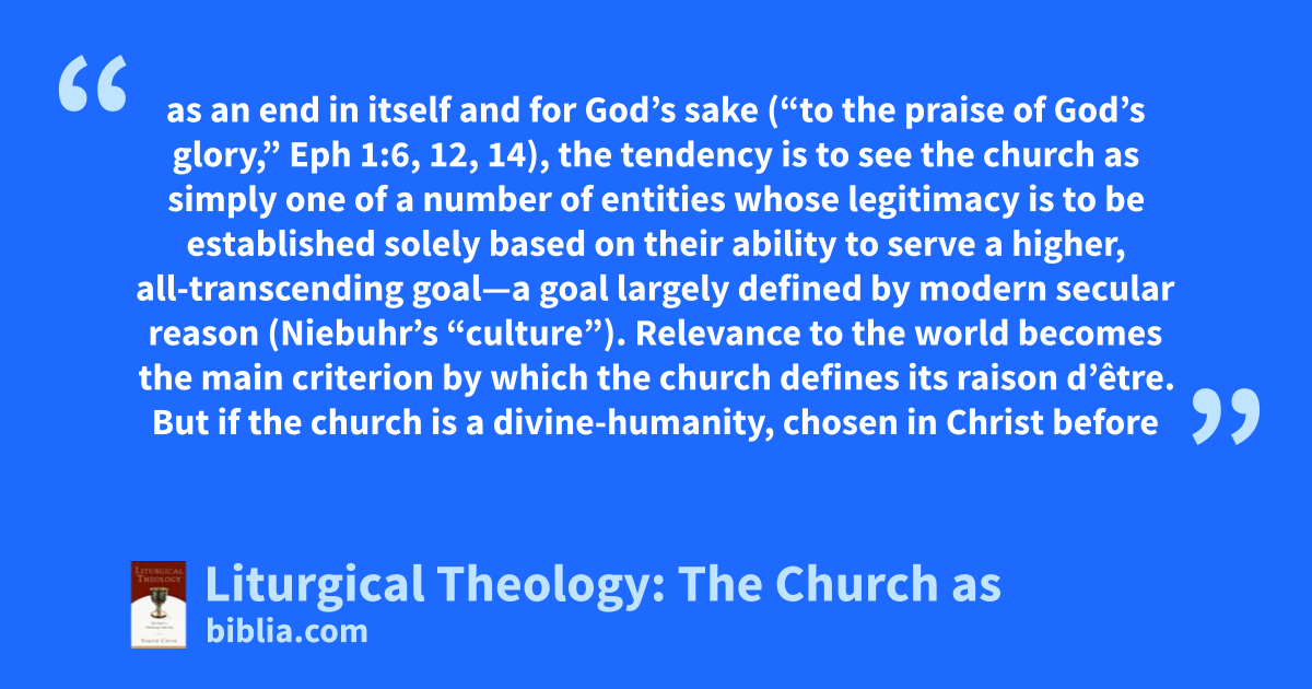 as an end in itself and for God’s sake (“to the praise of God’s glory,” Eph 1:6, 12, 14), the tendency is to see the church as simply one of a number of entities whose legitimacy is to be established solely based on their ability to serve a higher, all-transcending goal—a goal largely defined by modern secular reason (Niebuhr’s “culture”). Relevance to the world becomes the main criterion by which the church defines its raison d’être. But if the church is a divine-humanity, chosen in Christ before