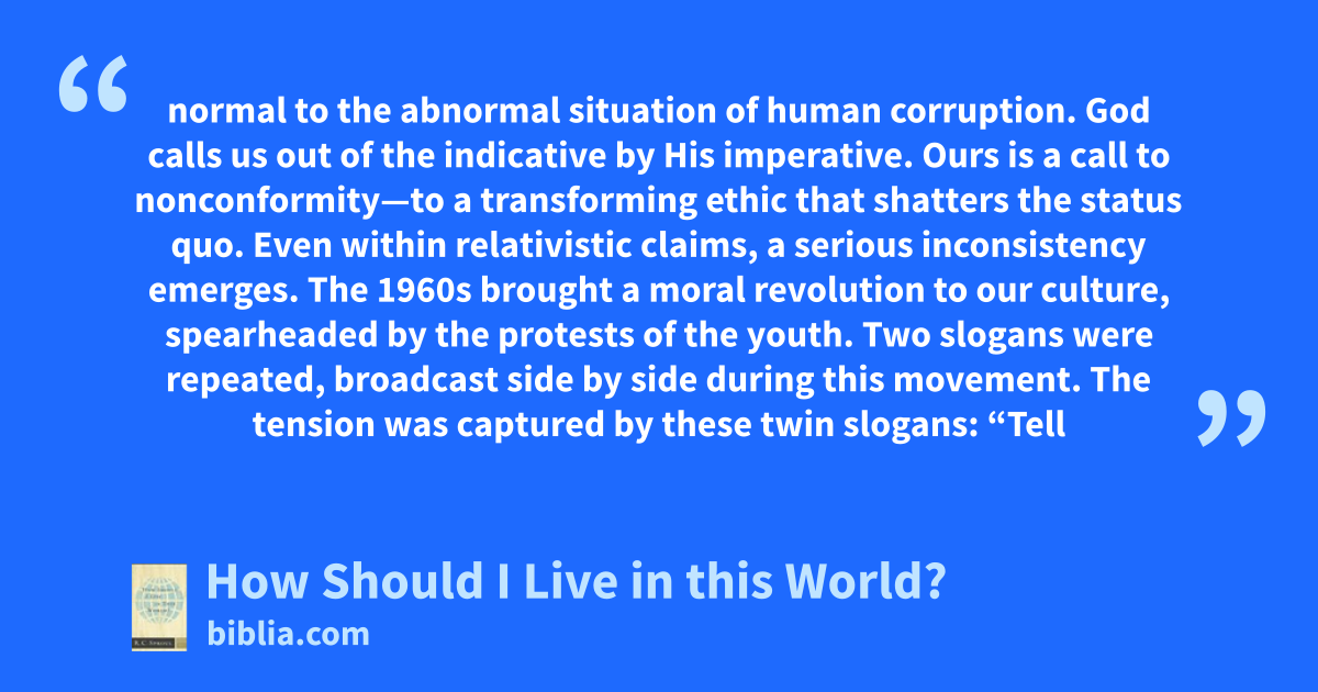 normal to the abnormal situation of human corruption. God calls us out of the indicative by His imperative. Ours is a call to nonconformity—to a transforming ethic that shatters the status quo. Even within relativistic claims, a serious inconsistency emerges. The 1960s brought a moral revolution to our culture, spearheaded by the protests of the youth. Two slogans were repeated, broadcast side by side during this movement. The tension was captured by these twin slogans: “Tell