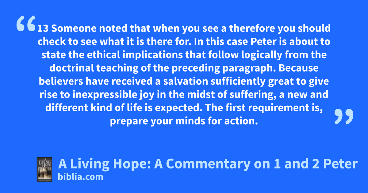 13 Someone noted that when you see a therefore you should check to see what it is there for. In this case Peter is about to state the ethical implications that follow logically from the doctrinal teaching of the preceding paragraph. Because believers have received a salvation sufficiently great to give rise to inexpressible joy in the midst of suffering, a new and different kind of life is expected. The first requirement is, prepare your minds for action.