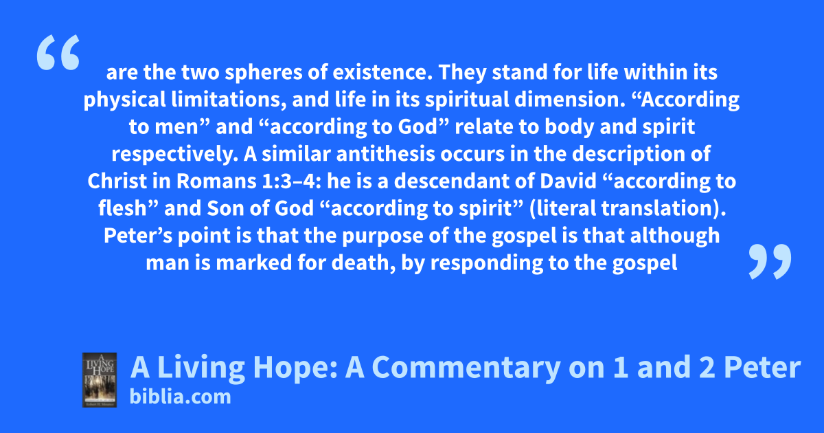 are the two spheres of existence. They stand for life within its physical limitations, and life in its spiritual dimension. “According to men” and “according to God” relate to body and spirit respectively. A similar antithesis occurs in the description of Christ in Romans 1:3–4: he is a descendant of David “according to flesh” and Son of God “according to spirit” (literal translation). Peter’s point is that the purpose of the gospel is that although man is marked for death, by responding to the gospel