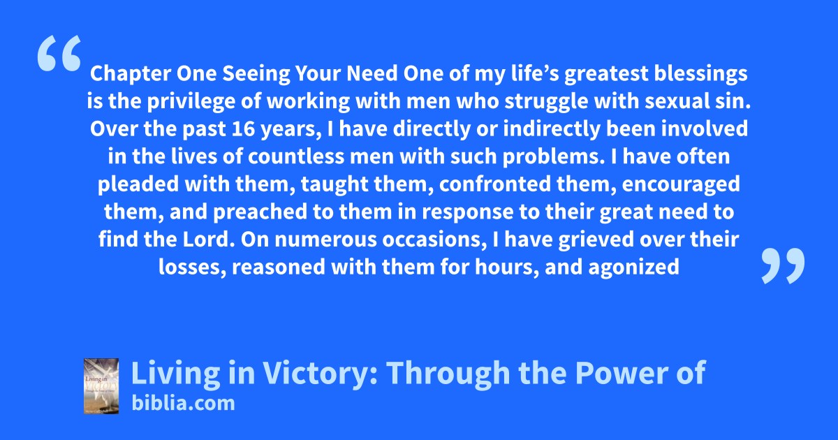 Chapter One Seeing Your Need One of my life’s greatest blessings is the privilege of working with men who struggle with sexual sin. Over the past 16 years, I have directly or indirectly been involved in the lives of countless men with such problems. I have often pleaded with them, taught them, confronted them, encouraged them, and preached to them in response to their great need to find the Lord. On numerous occasions, I have grieved over their losses, reasoned with them for hours, and agonized