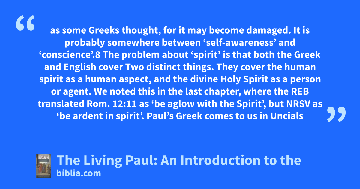 as some Greeks thought, for it may become damaged. It is probably somewhere between ‘self-awareness’ and ‘conscience’.8 The problem about ‘spirit’ is that both the Greek and English cover Two distinct things. They cover the human spirit as a human aspect, and the divine Holy Spirit as a person or agent. We noted this in the last chapter, where the REB translated Rom. 12:11 as ‘be aglow with the Spirit’, but NRSV as ‘be ardent in spirit’. Paul’s Greek comes to us in Uncials