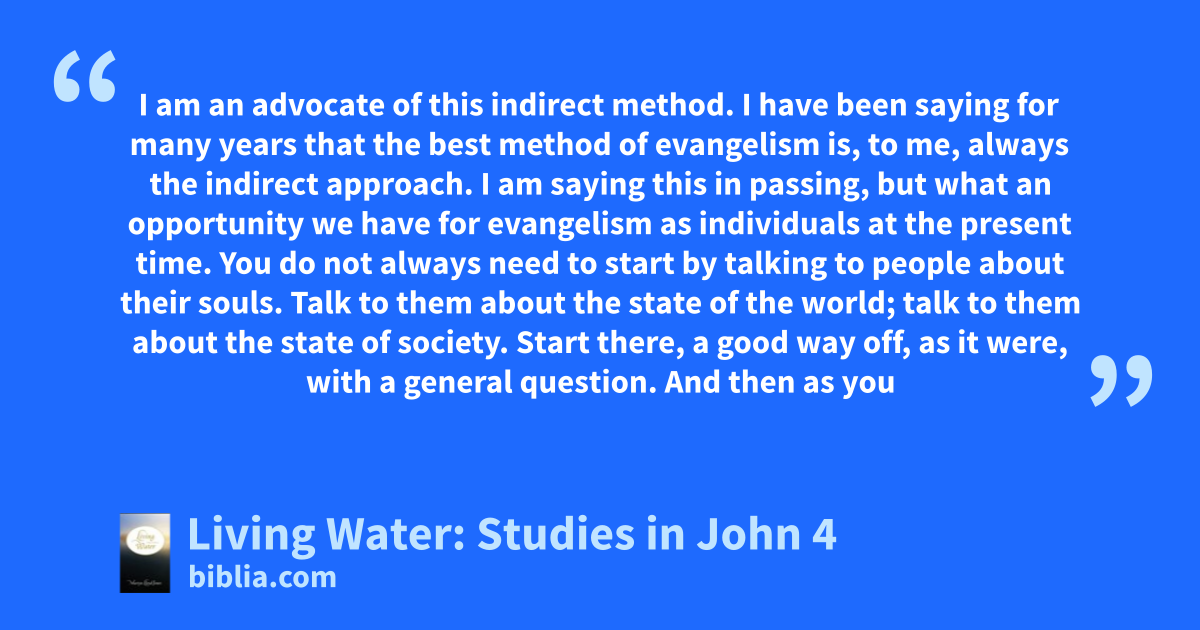 I am an advocate of this indirect method. I have been saying for many years that the best method of evangelism is, to me, always the indirect approach. I am saying this in passing, but what an opportunity we have for evangelism as individuals at the present time. You do not always need to start by talking to people about their souls. Talk to them about the state of the world; talk to them about the state of society. Start there, a good way off, as it were, with a general question. And then as you