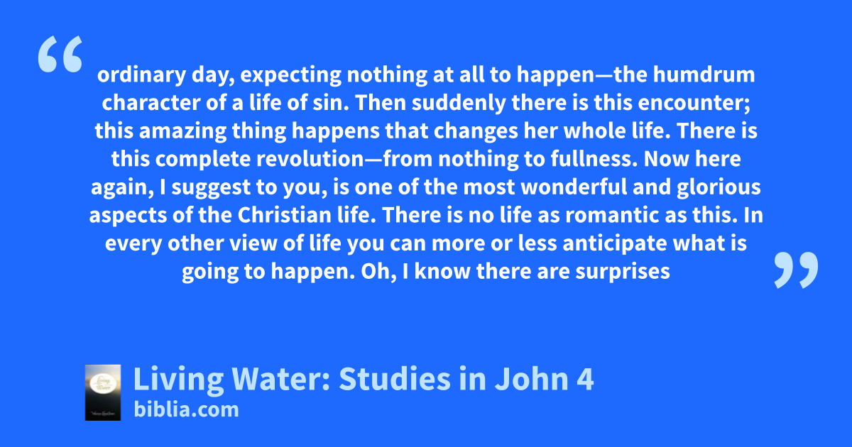 ordinary day, expecting nothing at all to happen—the humdrum character of a life of sin. Then suddenly there is this encounter; this amazing thing happens that changes her whole life. There is this complete revolution—from nothing to fullness. Now here again, I suggest to you, is one of the most wonderful and glorious aspects of the Christian life. There is no life as romantic as this. In every other view of life you can more or less anticipate what is going to happen. Oh, I know there are surprises